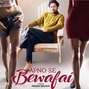अष्ठविनायक इन्टरप्राइजेज के बैनर तले पीयूष शाह द्वारा निर्मित फिल्म ‘अपनों से बेवफाई’ 29 जून को रिलीज होगी। इस फिल्म में इरफान खान दमदार भूमिका में नज़र आएंगे। फिल्म की कहानी एक्स्ट्रा मैरिटल अफेयर पर आधारित है। पैसा ज़िंदगी के लिए बहुत महत्वपूर्ण है उसके  बिना ढंग से जीवन यापन नहीं किया जा सकता इस कटु सच्चाई को हम झुठला नहीं सकते। मगर कम समय में और गलत तरीकों से ज्यादा पैसा कमाए जाने के बाद कभी कभी इतना बड़ा खामियाजा भुगतना पड़ता है कि सारी दुनियां और अपने भी बेगाने हो जाते हैं। इसी बात को फिल्म की कथावस्तु का आधार बनाया गया है। फिल्म का कैरेक्टर विशाल मुम्बईया फिल्मों का एक बेहतरीन एक्टर है मगर उसके बड़े बड़े ख्वाब हैं और कम समय में सुपर स्टार बनने की चाह और झटके में अमीर बनने के नशे को कुदरत का ग्रीन सिंग्नल नहीं मिल पाता है लम्बे चौड़े खर्चों की वजह से उसकी ज़िंदगी एक हाशिये पर आकर रुक जाती है जिसकी वजह से उसका फ्रस्टेशन बढ़ जाता है।