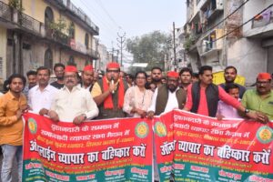 कानपुर, समाजवादी व्यापार सभा कानपुर नगर के खुदरा,फुटकर और छोटे दुकानदारों के समर्थन में ऑनलाइन व्यापार के खिलाफ  पदयात्रा का कार्यक्रम कैनाल रोड,एक्सप्रेस रोड,नयागंज आदि क्षेत्रों में आयोजित किया गया।ऑनलाइन खरीदारी के विरोध में घर से निकल कर दुकानदारों से ही खरीदारी करने की अपील के साथ पदयात्रा का आयोजन हुआ।लोगों से अपील करी की अपने आस पास के दुकानदारों की मदद के लिए घरों से निकल कर खरीदारी करें और संकल्प लें की इस त्यौहार ऑनलाइन ख़रीदारी नहीं करेंगे।सपा के प्रदेश वरिष्ठ उपाध्यक्ष और प्रवक्ता अभिमन्यु ने बताया की नोटबन्दी,जीएसटी,लौकडाउन,मंदी व महँगाई से सबसे ज़्यादा छोटा व्यापारी व दुकानदार टूटा हुआ है। हमसब को मिलकर दुकानदार भाइयों की मदद करनी है।ऑनलाइन व्यापार के कारण छोटे दुकानदार बर्बाद हो गए हैं।समाजवादी व्यापार सभा की सभी कानपुर जिला इकाईयों ने राष्ट्रीय अध्यक्ष अखिलेश यादव के निर्देश पर पदयात्रा आयोजित कर व्यापारी समाज को संदेश दिया है की भाजपा ने हमेशा छोटे व्यापारियों को छला है और केवल सपा सरकार में ही छोटे व्यापारी सम्मान से जी पाए हैं।कानपुर नगर अध्यक्ष सपा फजल महमूद ने बताया की पहले ही भाजपा के राज में  नोटबंदी,जीएसटी और इंस्पेक्टर राज के कारण छोटा व्यापारी त्राहि त्राहि कर रहा है।व्यापार सभा कानपुर नगर अध्यक्ष नंदलाल जायसवाल ने कहा की चौपट होता खुदरा व्यापार कारण जिसका ई व्यापार का नारा देकर दुकानदार भाइयों से खरीदारी करने की अपील के साथ सरकार से छोटे व्यापारियों को संरक्षण देने की मांग की।