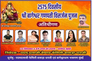 रेकोला पी आर एजेंसी के प्रबंध निदेशक लक्ष्मण कुमार वैष्णव द्वारा मुम्बई के मीरा भयंदर में 5 सितम्बर 2016 को स्थापित 2575 दिवसीय ‘श्री बागेश्वर गणपति बप्पा’ का विसर्जन 24 सितम्बर को होगा। इस विसर्जन कार्यक्रम में कई बॉलीवुड सेलिब्रिटीज शामिल होगी। लक्ष्मण कुमार वैष्णव राजस्थान के जालोर जिले के बासड़ा धनजी गांव के मूल निवासी हैं। ‘गणपति बप्पा’ को स्थापित करते समय ही लक्ष्मण कुमार वैष्णव ने निर्णय लिया था कि वो सात वर्षों के बाद विसर्जन करेंगे।
