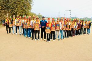 कानपुर। कानपुर डिफेंस फिजिकल एकेडमी के द्वारा सम्मान समारोह का आयोजन नौबस्ता स्थित एकेडमी भवन में आयोजित हुआ जहां बड़ी संख्या में सेना सहित अन्य विभागों में छात्र छात्राएं मौजूद रहे। आयोजक एवं एकेडमी डायरेक्टर सौरभ शुक्ला ने बताया कि एसएससी जीडी फाइनल में सलेक्टेड छात्र छात्राओं को भव्य सम्मान समारोह में सम्मानित किया जा रहा है। वहीं गोल्ड मेडल लाने वाले रवि कुमार पाल को मंच पर डायरेक्टर सौरभ शुक्ला एवं कोच आदित्य शुक्ला ने पगड़ी पटका माल्यार्पण बाबा श्री श्याम की प्रतिमा भेट कर सम्मानित किया।