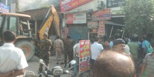 कानपुर। किदवई नगर साइड नंबर वन चौराहा स्थित मामा भांजे के नाम से चला रहे वेज बिरयानी कबाब पराठा की बन्द दुकान पर नगर निगम के अधिकारियों द्वारा बुलडोजर से अवैध अतिक्रमण हटाया गया। जिसमें साइन बोर्ड, टिनसेट, ग्लो साइन बोर्ड, दुकान के सामने लगे पिलर का अतिक्रमण हटाया गया।