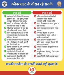 8. ब्लैक आउट अवधि में विभिन्न शासकीय भवनों, निजी प्रतिष्ठानों एवं व्यावसायिक प्रतिष्ठानों के बाहर लगी बिल बोर्ड, स्कीन, होर्डिंग, साइन बोर्ड, फसाड लाइटिंग इत्यादि को बंद रखेंगे, ताकि आबादी क्षेत्र की कोई पहचान हवाई साधन से न की जा सके। ऐसे प्रतिष्ठानों के स्वामियों, एडवर्टाइजिंग ऐजेसियों के संचालकों तथा नगर निगम का दायित्व होगा कि ऐसे साइन बोर्ड इत्यादि को सायंकाल 09.30 बजे से 10.00 बजे के मध्य विद्युत आपूर्ति न की जाए।