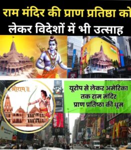 अतः अगर हम उपरोक्त पूरे विवरण का अध्ययन कर इसका विश्लेषण करें तो हम पाएंगे कि दुनियां भर में प्रभु श्रीराम की गूंज।सात समंदर पार धरती से आसमान तक सिर्फ राम नाम की गूंज।प्राण प्रतिष्ठा दिवसजैसे-जैसे नजदीक आ रहा है, दुनियां के सव से अधिक देशों में भजन कीर्तन दीपोत्सव के जश्न का सैलाब उमड़ पड़ा है।